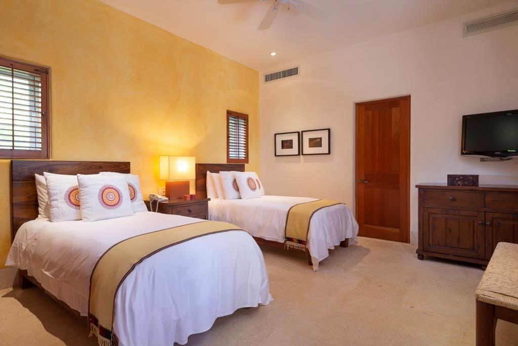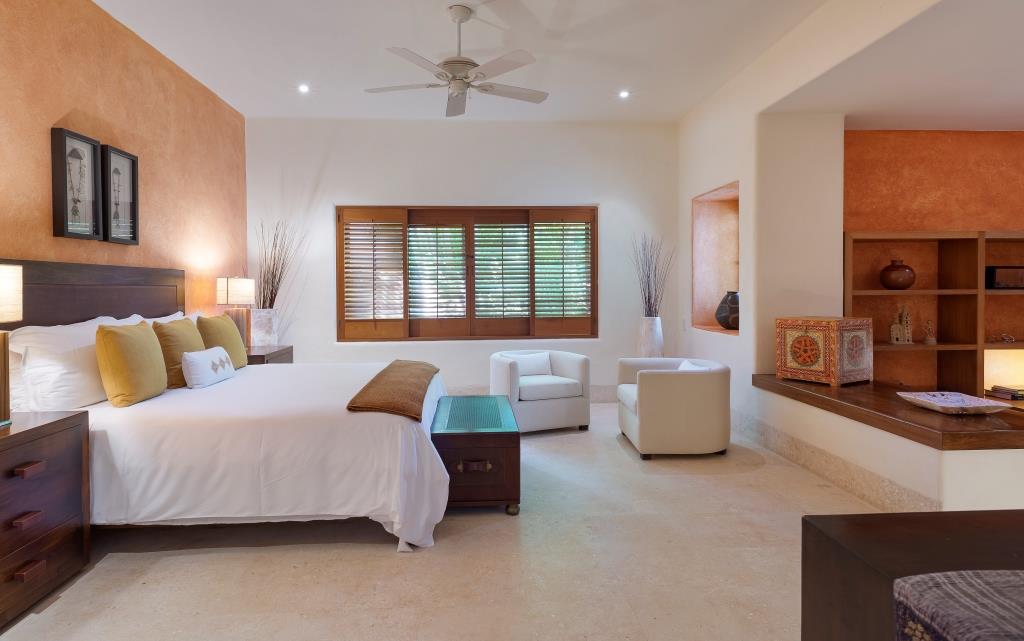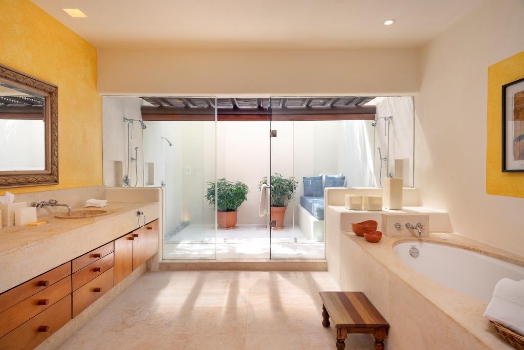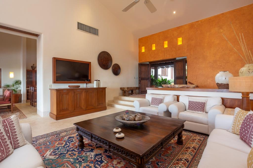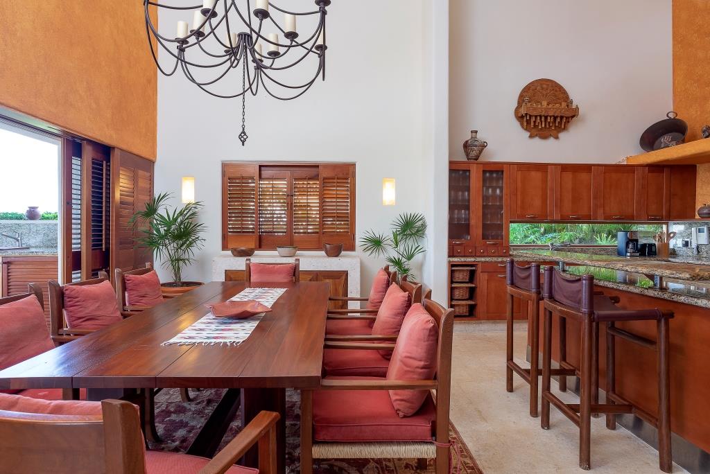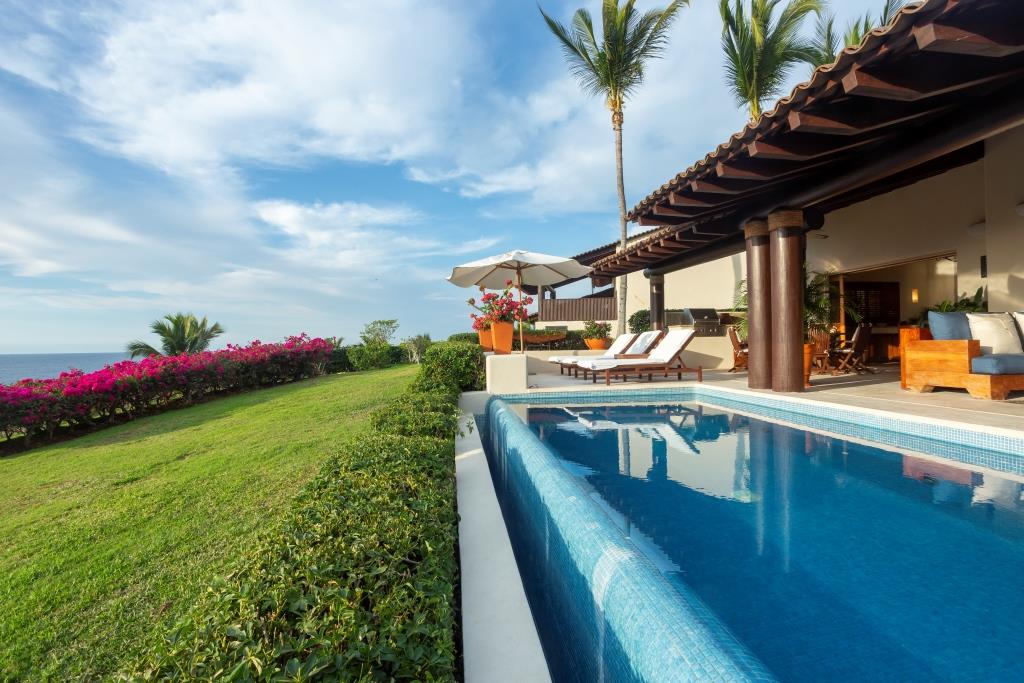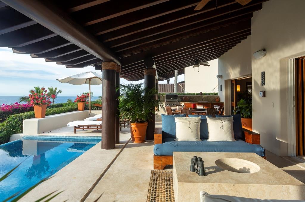 The spacious terrace centers around a main infinity pool that appears to merge with the sea, flanked by a full outdoor living room, a circular dining area, and a grill station with a mini-fridge and ice maker.
